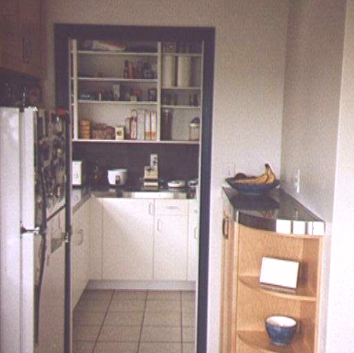 This kitchen was cramped. The owner traded an under-used breakfast nook and part of a former entry hall for a larger, more functional space. The previous sink area was enclosed to form a butler's pantry and prep area, which can be hidden behind a pocket door when entertaining.